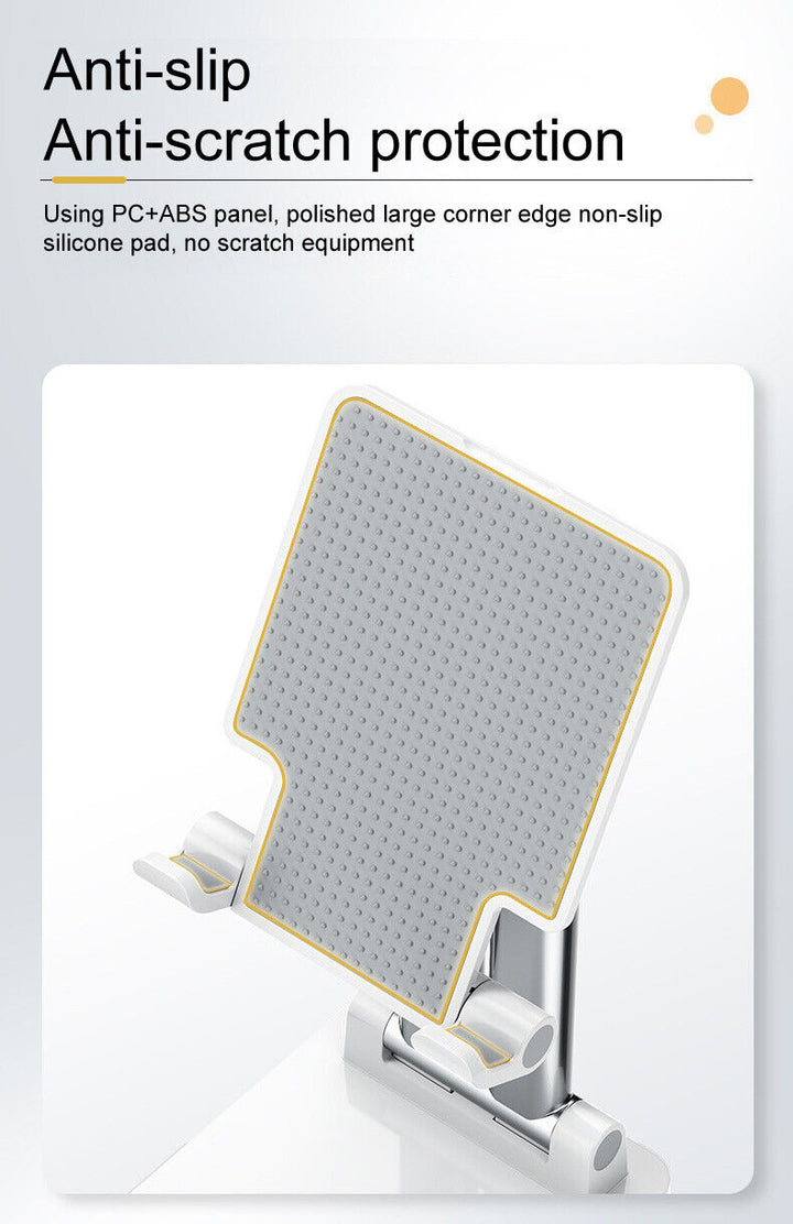 - 【Super Sturdy & Non-Slip Silicone Pad】 - This desktop phone stand adopts durable aluminum with a strong solid construction, assuring your phone stay firmly in place. The silicone covered pads and metal weighted anti-slip base well protect your devices from scratches and sliding, easily tap the screen without worrying the phone will tip over or fall off.